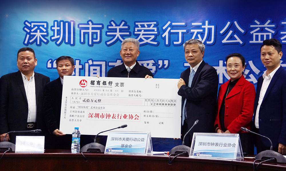 12月9 日,由深圳市關愛行動公益基金會倡導、深圳市鐘表行業協會發起,凝聚愛心企業、藝術家的專項基金——“時間有愛”藝術公益基金在深舉行了簽約儀式。深圳市雷諾表業有限公司董事長詹西洲先生作為基金發起方代表與深圳市鐘表行業協會會長朱舜華先生及其他企業代表共同出席揭牌儀式。